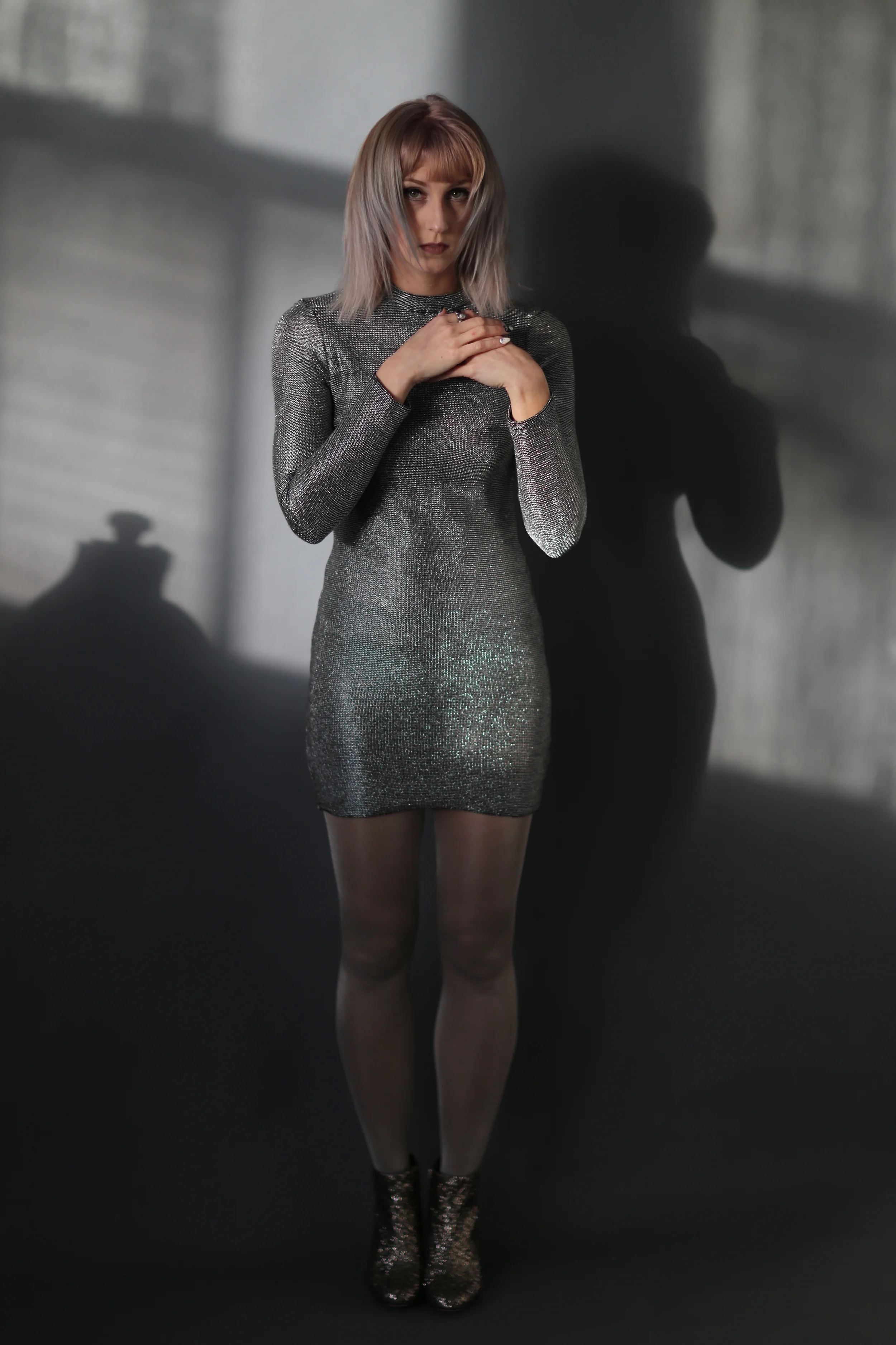 I shot with Myles Katherine, Portland model and photographer, in December 2015. She's a lovely, talented person and always a joy to shoot with. We had a multiple set-up shoot with different outfits and make-up by Gina Campbell. The fifth set centered around a fantastic silver dress that we both joked looked like something David Bowie would love (not knowing he would soon pass away).